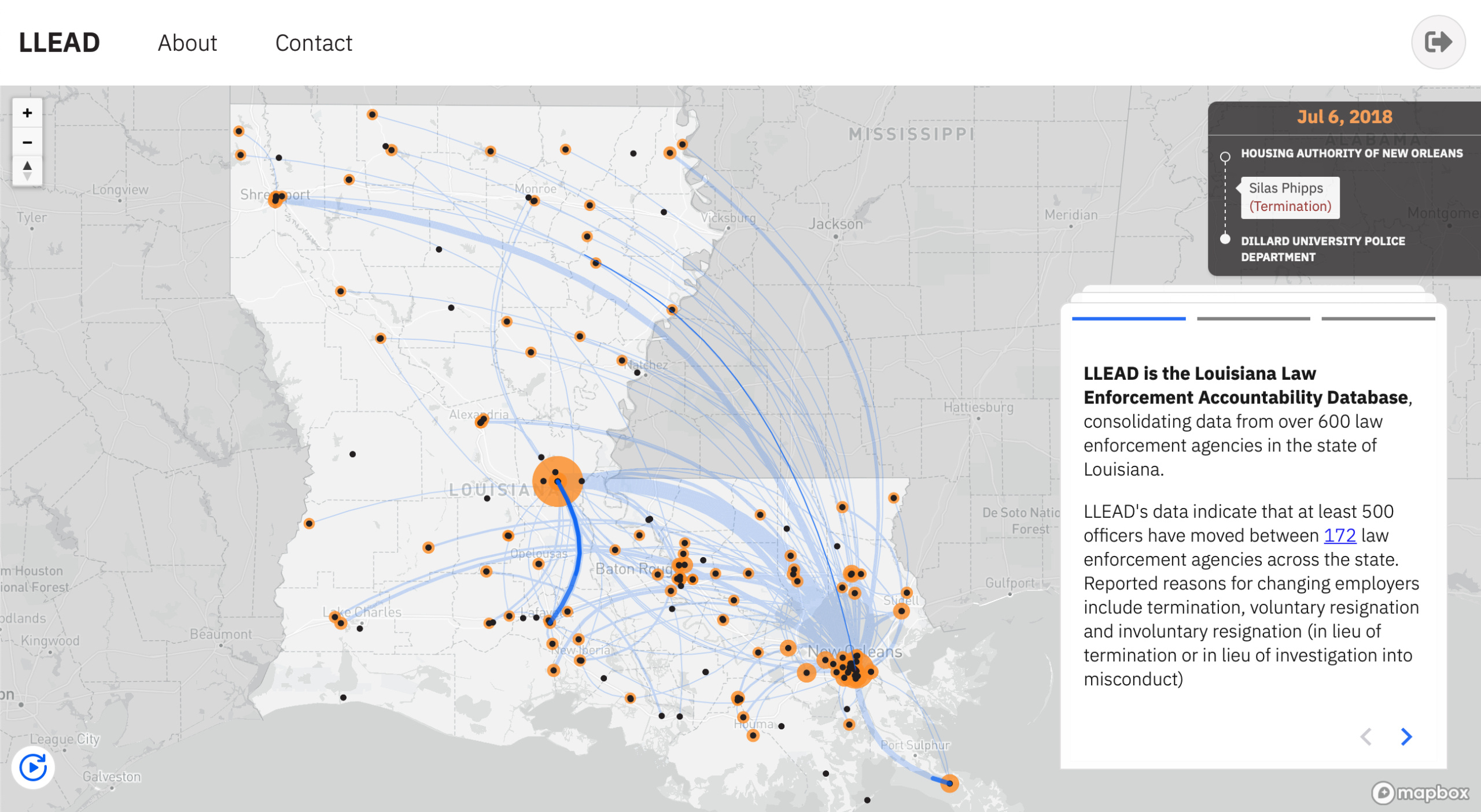 We are working together with the Innocence Project New Orleans (IPNO) to build a statewide database of police officers, police misconduct investigations, use of force, and related news articles.LLEAD.co is available to the public now. We are also publishing the data processing scripts and useful underlying technologies datamatch and datavalid as open-source projects on GitHub.Building upon LLEAD, we are collaborating with Tarak Shah (HRDAG) on an investigation into patterns correlated with known wrongful convictions from IPNO’s case files, using a combination of text and structured information extracted from several new types of documents related to police misconduct and prosecutorial misconduct.